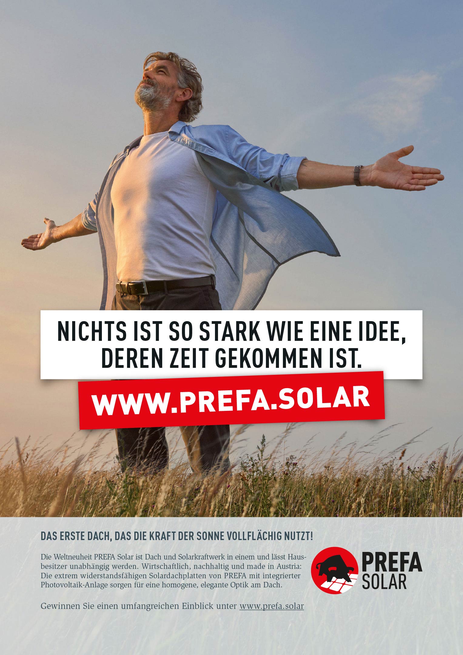Das ungebrochene Interesse an Photovoltaik-Dächern führte in den letzten Jahren zu einer Werbeoffensive vieler Anbieter und PREFA hatte bei Produkteinführung ordentlich Boden gutzumachen. Ziel der Launch-Kampagne war es dennoch, PREFA Solar als die ultimative Lösung zu positionieren, da es sich um das erste 2-in-1 Produkt handelt (Dach und PV-Anlage in einem).